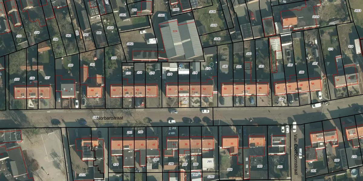 Het perceel waarop Norbartstraat 56 staat heeft een oppervlakte van 160 m². Dit is een middelgroot perceel. De perceeloppervlakte wordt geregistreerd door het Kadaster. Gedetailleerde informatie over de maten van dit perceel kunt u vinden in het rapport Kadastrale kaart met maatvoering van Norbartstraat 56.