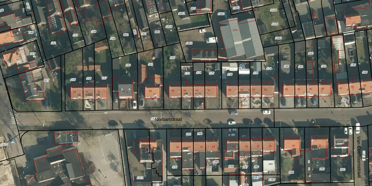 Het perceel waarop Norbartstraat 64 staat heeft een oppervlakte van 160 m². Dit is een middelgroot perceel. De perceeloppervlakte wordt geregistreerd door het Kadaster. Gedetailleerde informatie over de maten van dit perceel kunt u vinden in het rapport Kadastrale kaart met maatvoering van Norbartstraat 64.