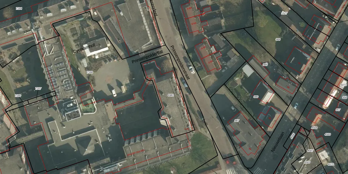 Het perceel waarop Prinsenpolderflat 2 staat heeft een oppervlakte van 715 m². Dit is een groot perceel. De perceeloppervlakte wordt geregistreerd door het Kadaster. Gedetailleerde informatie over de maten van dit perceel kunt u vinden in het rapport Kadastrale kaart met maatvoering van Prinsenpolderflat 2.