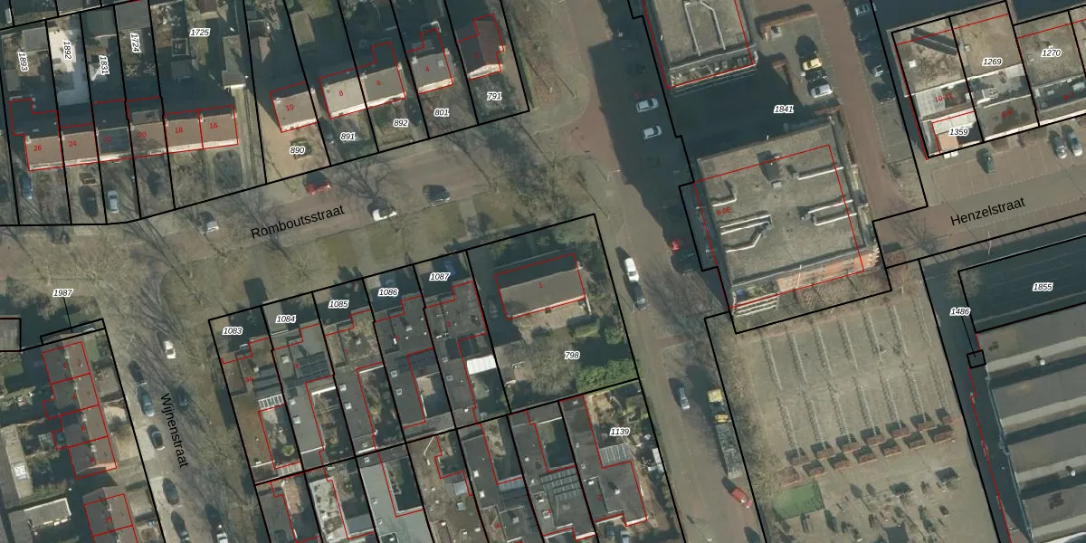 Het perceel waarop Romboutsstraat 1 staat heeft een oppervlakte van 775 m². Dit is een groot perceel. De perceeloppervlakte wordt geregistreerd door het Kadaster. Gedetailleerde informatie over de maten van dit perceel kunt u vinden in het rapport Kadastrale kaart met maatvoering van Romboutsstraat 1.