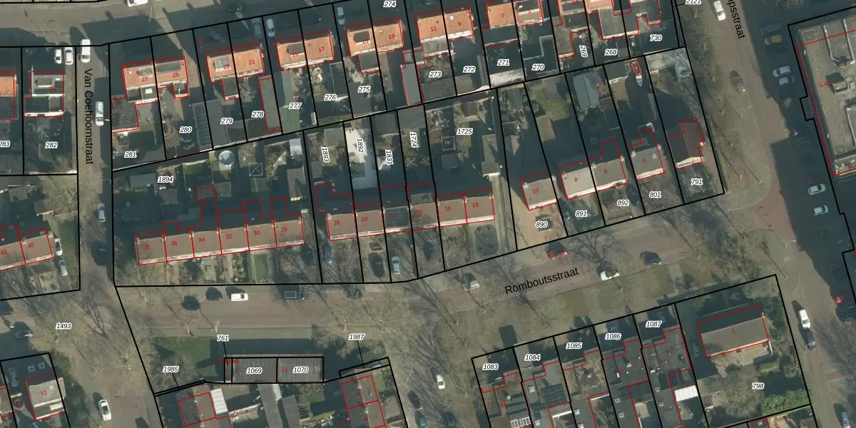 Het perceel waarop Romboutsstraat 20 staat heeft een oppervlakte van 255 m². Dit is een middelgroot perceel. De perceeloppervlakte wordt geregistreerd door het Kadaster. Gedetailleerde informatie over de maten van dit perceel kunt u vinden in het rapport Kadastrale kaart met maatvoering van Romboutsstraat 20.