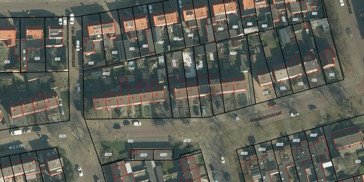 Het perceel waarop Romboutsstraat 26 staat heeft een oppervlakte van 355 m². Dit is een groot perceel. De perceeloppervlakte wordt geregistreerd door het Kadaster. Gedetailleerde informatie over de maten van dit perceel kunt u vinden in het rapport Kadastrale kaart met maatvoering van Romboutsstraat 26.