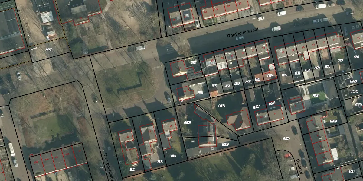 Het perceel waarop Romboutsstraat 39 staat heeft een oppervlakte van 246 m². Dit is een middelgroot perceel. De perceeloppervlakte wordt geregistreerd door het Kadaster. Gedetailleerde informatie over de maten van dit perceel kunt u vinden in het rapport Kadastrale kaart met maatvoering van Romboutsstraat 39.