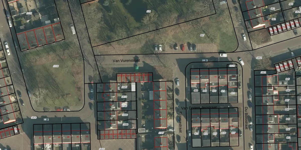 Het perceel waarop Van Vurenstraat 51-A staat heeft een oppervlakte van 2395 m². Dit is een zeer groot perceel. De perceeloppervlakte wordt geregistreerd door het Kadaster. Gedetailleerde informatie over de maten van dit perceel kunt u vinden in het rapport Kadastrale kaart met maatvoering van Van Vurenstraat 51-A.