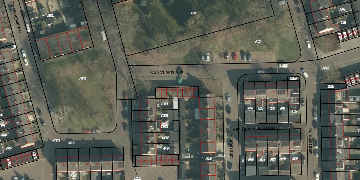Het perceel waarop Van Vurenstraat 51-D staat heeft een oppervlakte van 2395 m². Dit is een zeer groot perceel. De perceeloppervlakte wordt geregistreerd door het Kadaster. Gedetailleerde informatie over de maten van dit perceel kunt u vinden in het rapport Kadastrale kaart met maatvoering van Van Vurenstraat 51-D.