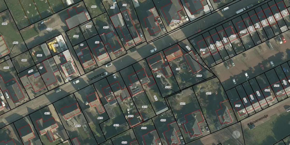 Het perceel waarop Zandstraat 36 staat heeft een oppervlakte van 377 m². Dit is een groot perceel. De perceeloppervlakte wordt geregistreerd door het Kadaster. Gedetailleerde informatie over de maten van dit perceel kunt u vinden in het rapport Kadastrale kaart met maatvoering van Zandstraat 36.