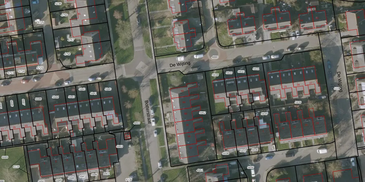 Het perceel waarop Botterstraat 62 staat heeft een oppervlakte van 1295 m². Dit is een zeer groot perceel. De perceeloppervlakte wordt geregistreerd door het Kadaster. Gedetailleerde informatie over de maten van dit perceel kunt u vinden in het rapport Kadastrale kaart met maatvoering van Botterstraat 62.