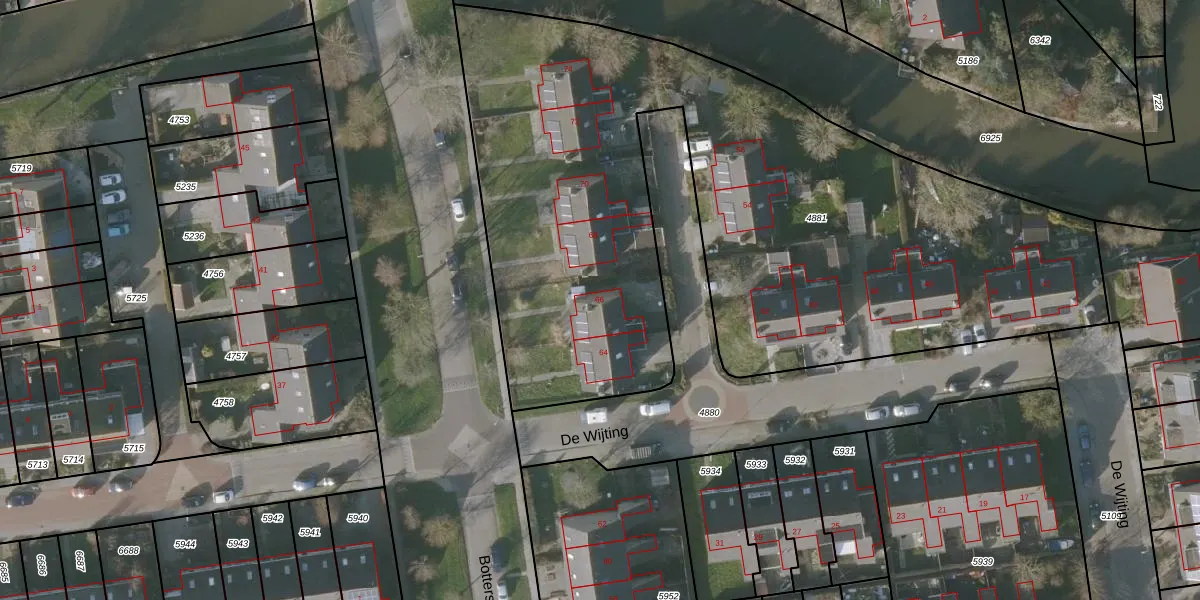 Het perceel waarop Botterstraat 66 staat heeft een oppervlakte van 4229 m². Dit is een zeer groot perceel. De perceeloppervlakte wordt geregistreerd door het Kadaster. Gedetailleerde informatie over de maten van dit perceel kunt u vinden in het rapport Kadastrale kaart met maatvoering van Botterstraat 66.