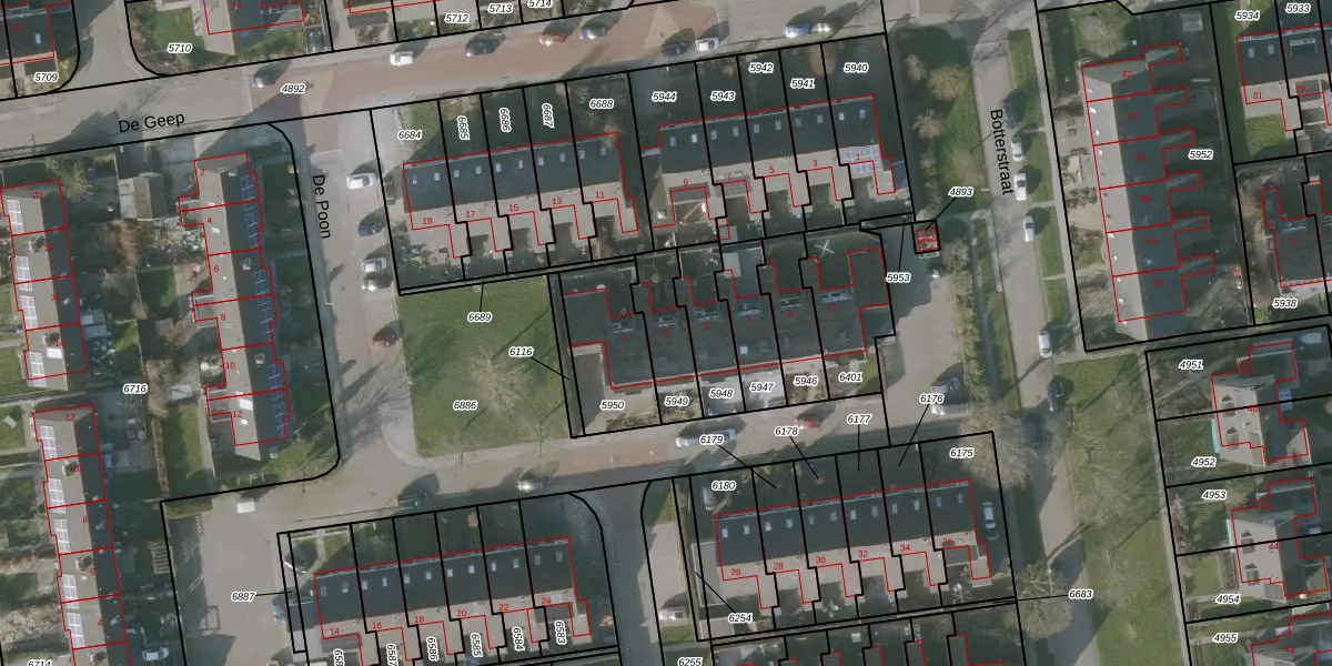 Het perceel waarop De Poon 3 staat heeft een oppervlakte van 165 m². Dit is een middelgroot perceel. De perceeloppervlakte wordt geregistreerd door het Kadaster. Gedetailleerde informatie over de maten van dit perceel kunt u vinden in het rapport Kadastrale kaart met maatvoering van De Poon 3.