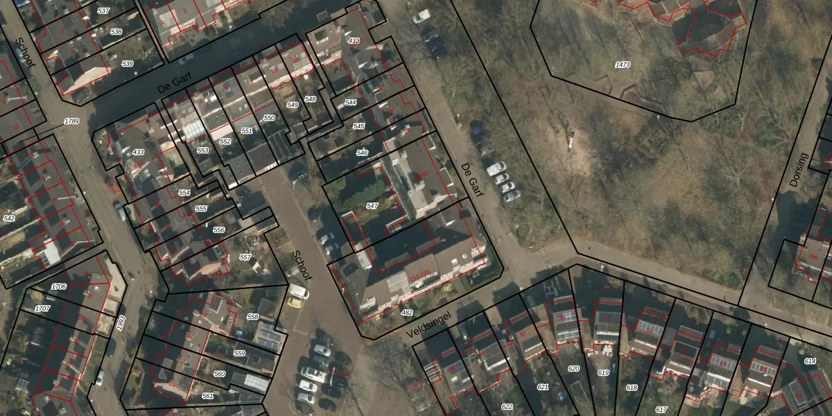 Het perceel waarop De Garf 42 staat heeft een oppervlakte van 547 m². Dit is een groot perceel. De perceeloppervlakte wordt geregistreerd door het Kadaster. Gedetailleerde informatie over de maten van dit perceel kunt u vinden in het rapport Kadastrale kaart met maatvoering van De Garf 42.
