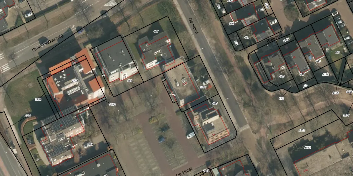 Het perceel waarop De Horst 2-E staat heeft een oppervlakte van 606 m². Dit is een groot perceel. De perceeloppervlakte wordt geregistreerd door het Kadaster. Gedetailleerde informatie over de maten van dit perceel kunt u vinden in het rapport Kadastrale kaart met maatvoering van De Horst 2-E.