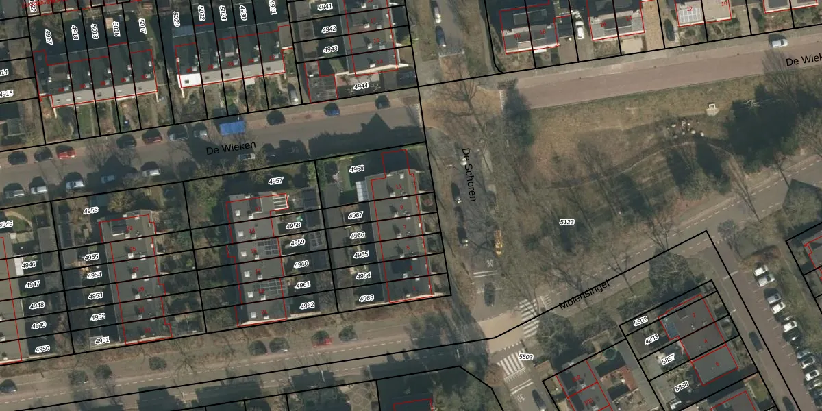 De Schoren 9 is gelegen op kadastraal perceel HMN01G4967. Deze kadastrale aanduiding is uniek en wordt gebruikt door het Kadaster om eigendomsrechten en andere zakelijke rechten vast te leggen. Het perceel maakt onderdeel uit van de kadastrale gemeente Heumen.
