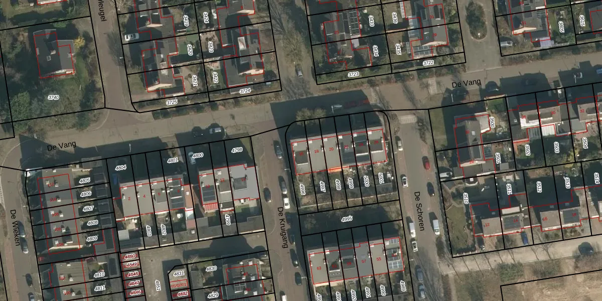 Het perceel waarop De Vang 16 staat heeft een oppervlakte van 202 m². Dit is een middelgroot perceel. De perceeloppervlakte wordt geregistreerd door het Kadaster. Gedetailleerde informatie over de maten van dit perceel kunt u vinden in het rapport Kadastrale kaart met maatvoering van De Vang 16.