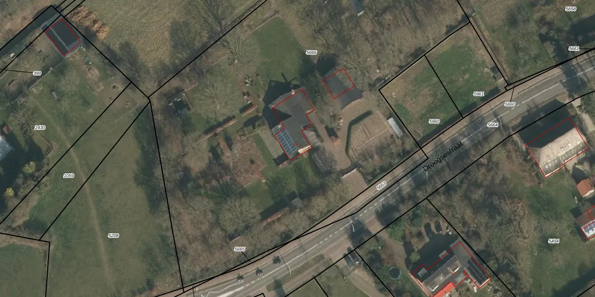 Het perceel waarop Droogsestraat 12 staat heeft een oppervlakte van 7030 m². Dit is een zeer groot perceel. De perceeloppervlakte wordt geregistreerd door het Kadaster. Gedetailleerde informatie over de maten van dit perceel kunt u vinden in het rapport Kadastrale kaart met maatvoering van Droogsestraat 12.