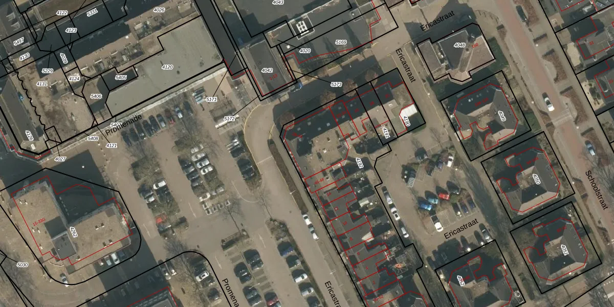Het perceel waarop Ericastraat 42 staat heeft een oppervlakte van 2015 m². Dit is een zeer groot perceel. De perceeloppervlakte wordt geregistreerd door het Kadaster. Gedetailleerde informatie over de maten van dit perceel kunt u vinden in het rapport Kadastrale kaart met maatvoering van Ericastraat 42.