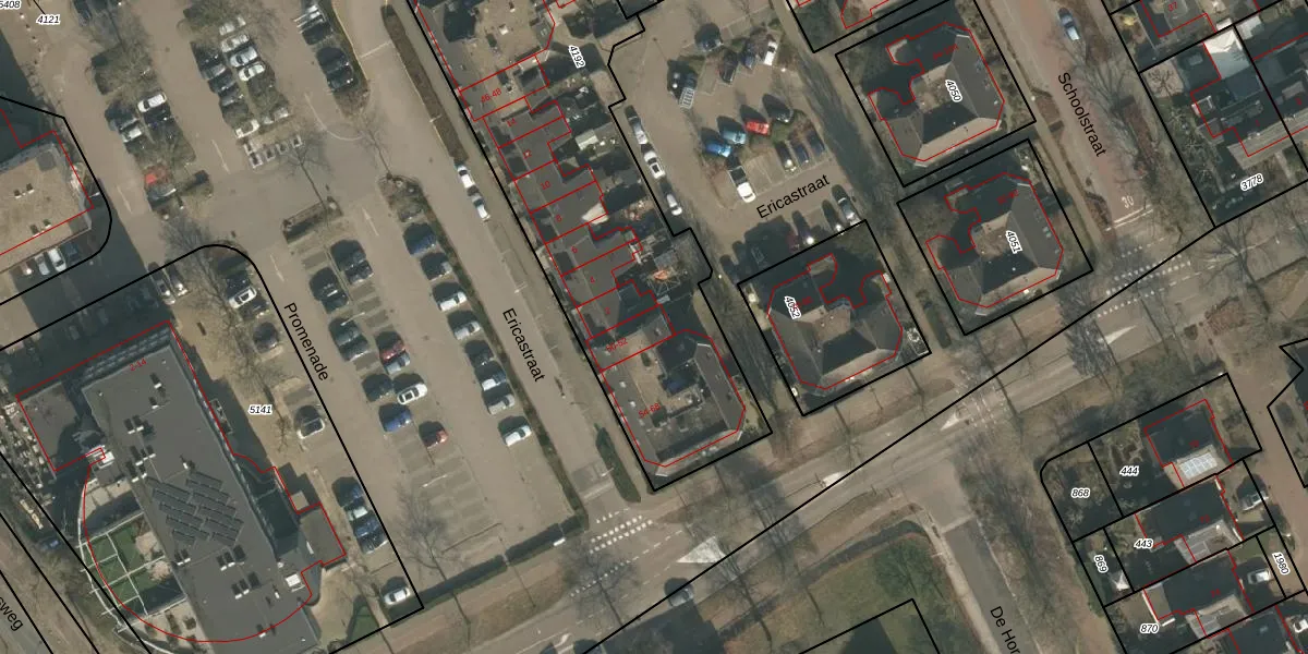 Het perceel waarop Ericastraat 50 staat heeft een oppervlakte van 2015 m². Dit is een zeer groot perceel. De perceeloppervlakte wordt geregistreerd door het Kadaster. Gedetailleerde informatie over de maten van dit perceel kunt u vinden in het rapport Kadastrale kaart met maatvoering van Ericastraat 50.