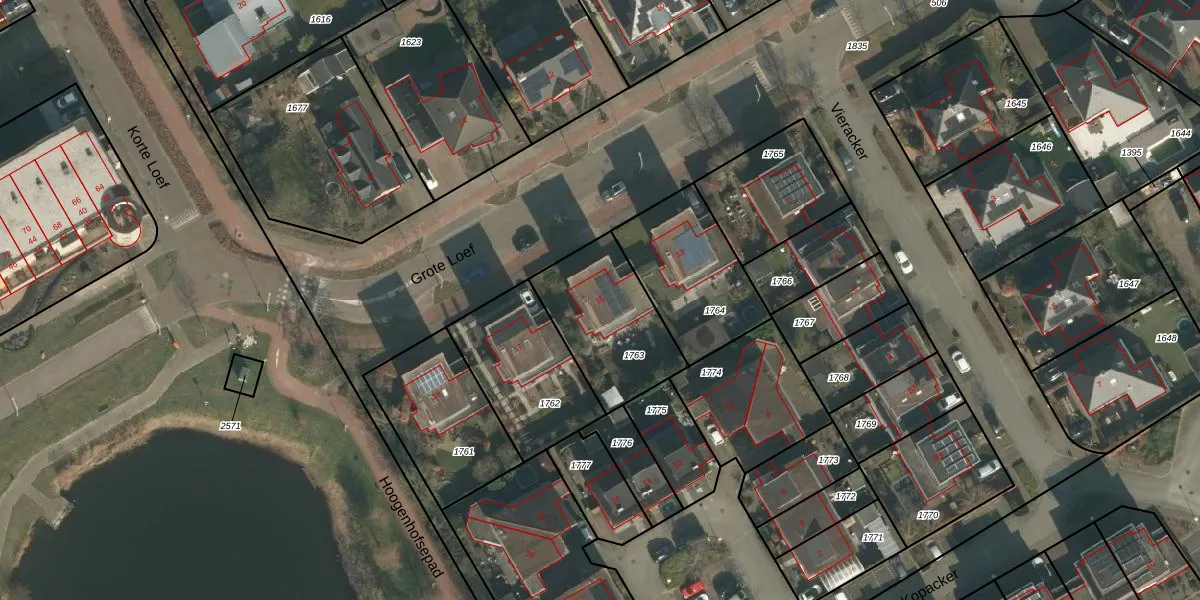 Het perceel waarop Grote Loef 15 staat heeft een oppervlakte van 415 m². Dit is een groot perceel. De perceeloppervlakte wordt geregistreerd door het Kadaster. Gedetailleerde informatie over de maten van dit perceel kunt u vinden in het rapport Kadastrale kaart met maatvoering van Grote Loef 15.