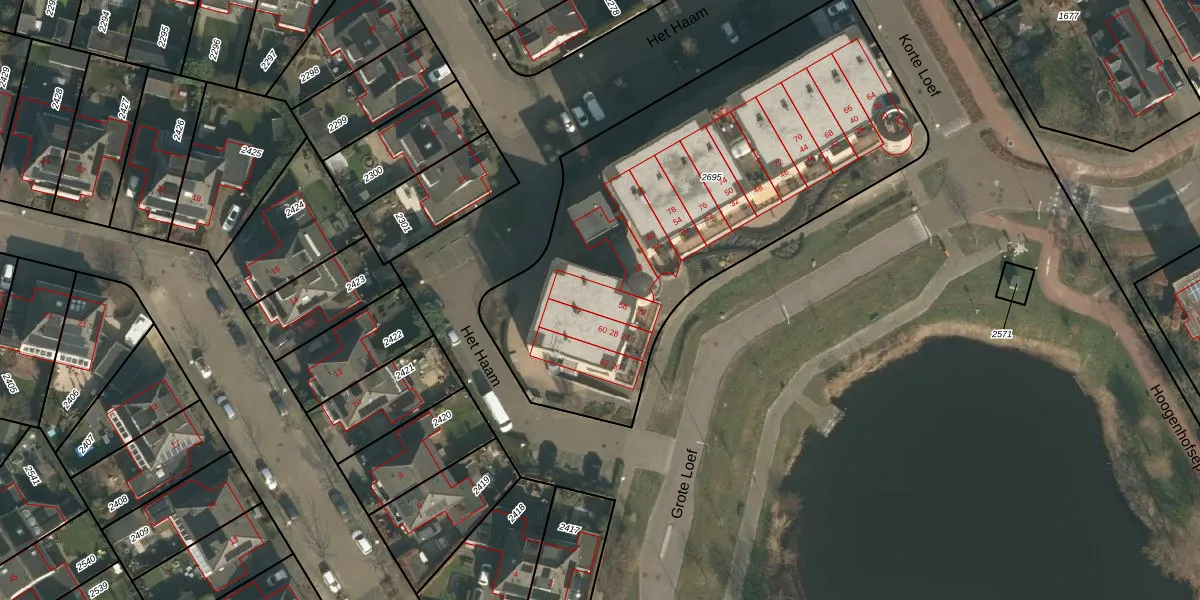 Het perceel waarop Grote Loef 22 staat heeft een oppervlakte van 2361 m². Dit is een zeer groot perceel. De perceeloppervlakte wordt geregistreerd door het Kadaster. Gedetailleerde informatie over de maten van dit perceel kunt u vinden in het rapport Kadastrale kaart met maatvoering van Grote Loef 22.
