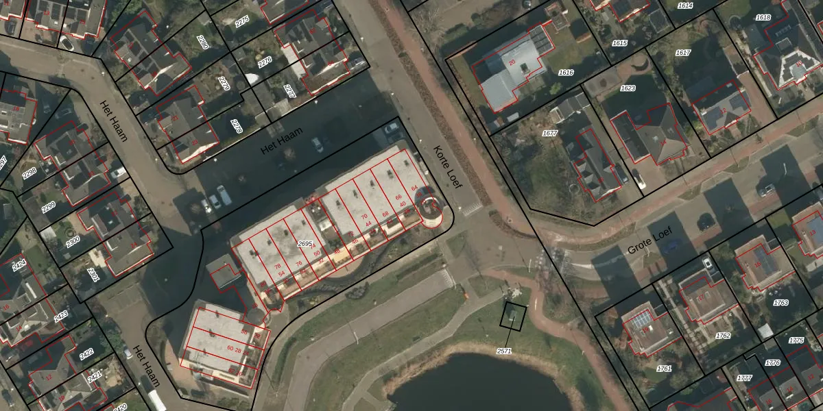 Het perceel waarop Grote Loef 36 staat heeft een oppervlakte van 2361 m². Dit is een zeer groot perceel. De perceeloppervlakte wordt geregistreerd door het Kadaster. Gedetailleerde informatie over de maten van dit perceel kunt u vinden in het rapport Kadastrale kaart met maatvoering van Grote Loef 36.