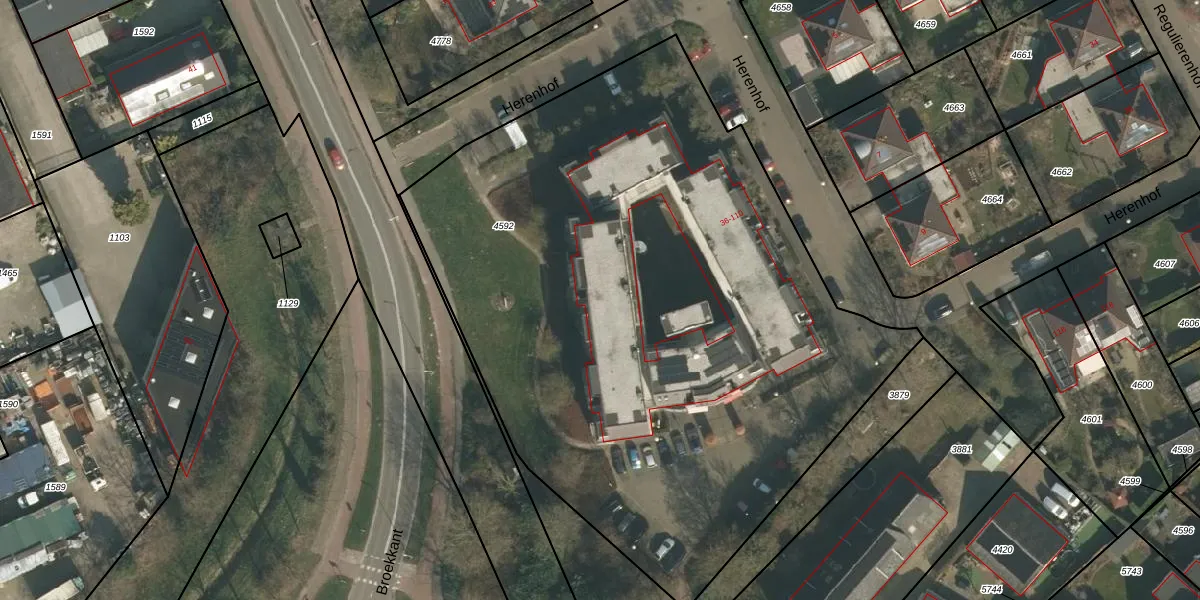 Het perceel waarop Herenhof 38 staat heeft een oppervlakte van 4330 m². Dit is een zeer groot perceel. De perceeloppervlakte wordt geregistreerd door het Kadaster. Gedetailleerde informatie over de maten van dit perceel kunt u vinden in het rapport Kadastrale kaart met maatvoering van Herenhof 38.