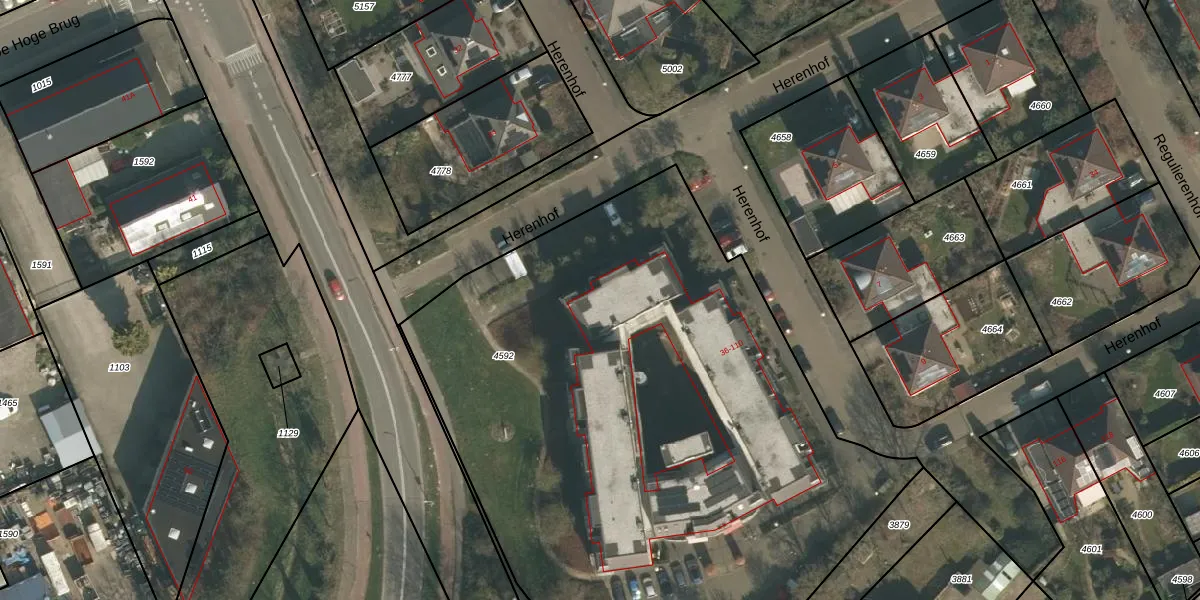 Het perceel waarop Herenhof 42 staat heeft een oppervlakte van 4330 m². Dit is een zeer groot perceel. De perceeloppervlakte wordt geregistreerd door het Kadaster. Gedetailleerde informatie over de maten van dit perceel kunt u vinden in het rapport Kadastrale kaart met maatvoering van Herenhof 42.