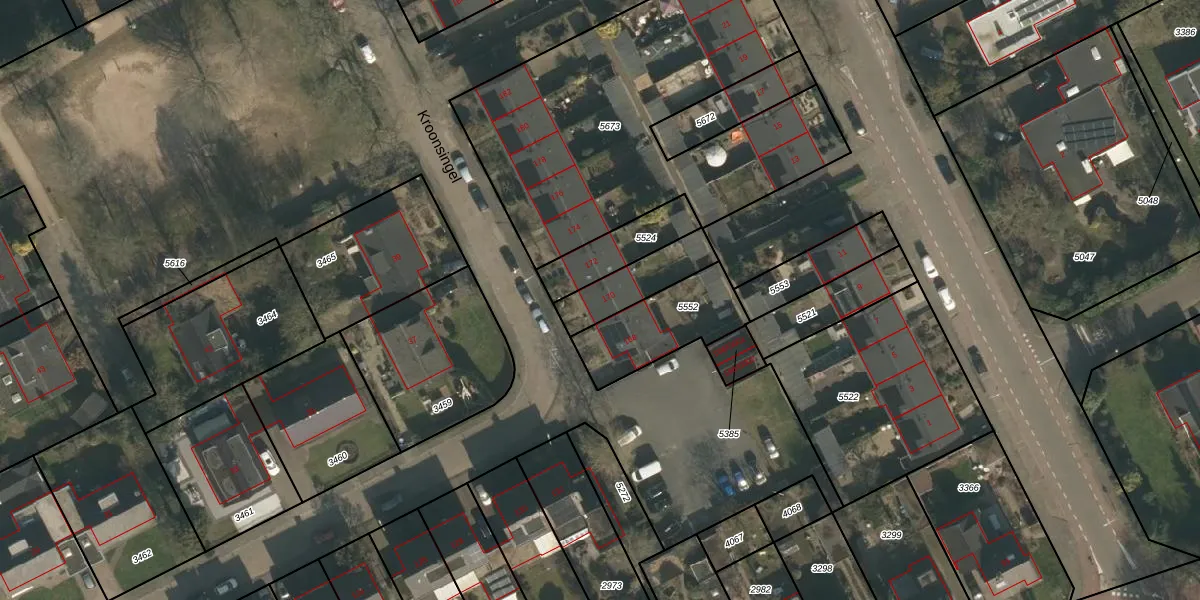 Het perceel waarop Kroonsingel 170 staat heeft een oppervlakte van 1961 m². Dit is een zeer groot perceel. De perceeloppervlakte wordt geregistreerd door het Kadaster. Gedetailleerde informatie over de maten van dit perceel kunt u vinden in het rapport Kadastrale kaart met maatvoering van Kroonsingel 170.