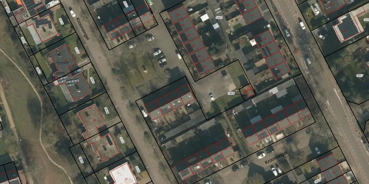 Het perceel waarop Kroonsingel 236 staat heeft een oppervlakte van 7869 m². Dit is een zeer groot perceel. De perceeloppervlakte wordt geregistreerd door het Kadaster. Gedetailleerde informatie over de maten van dit perceel kunt u vinden in het rapport Kadastrale kaart met maatvoering van Kroonsingel 236.