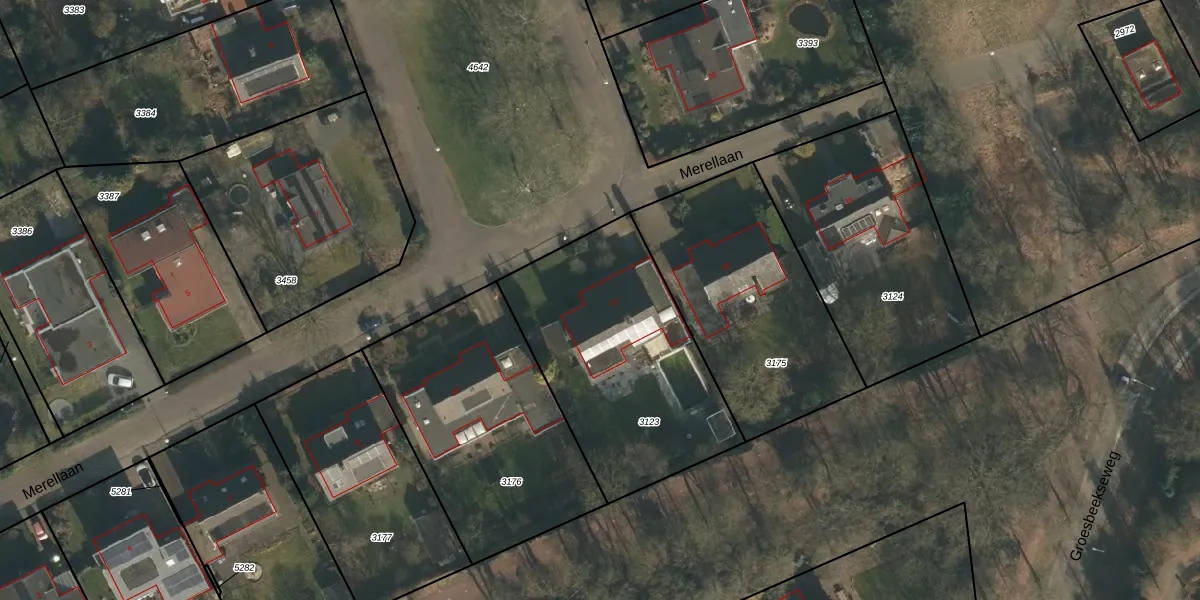 Het perceel waarop Merellaan 12 staat heeft een oppervlakte van 1059 m². Dit is een zeer groot perceel. De perceeloppervlakte wordt geregistreerd door het Kadaster. Gedetailleerde informatie over de maten van dit perceel kunt u vinden in het rapport Kadastrale kaart met maatvoering van Merellaan 12.