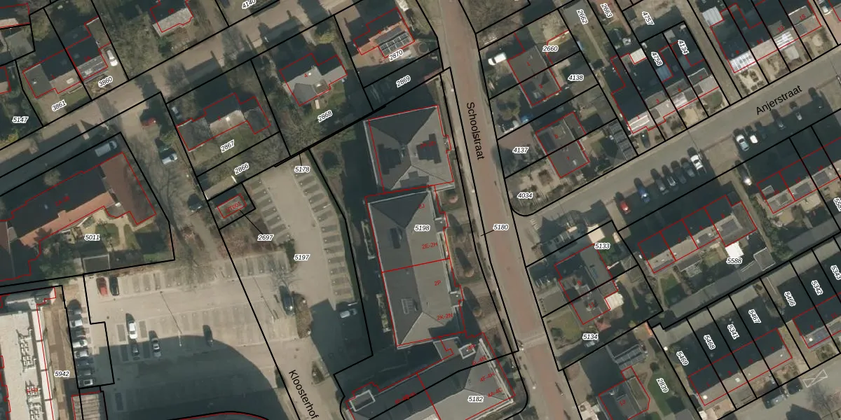Schoolstraat 2-E is gelegen op kadastraal perceel HMN01G5198. Deze kadastrale aanduiding is uniek en wordt gebruikt door het Kadaster om eigendomsrechten en andere zakelijke rechten vast te leggen. Het perceel maakt onderdeel uit van de kadastrale gemeente Heumen.