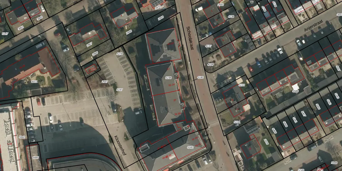 Schoolstraat 2-F is gelegen op kadastraal perceel HMN01G5198. Deze kadastrale aanduiding is uniek en wordt gebruikt door het Kadaster om eigendomsrechten en andere zakelijke rechten vast te leggen. Het perceel maakt onderdeel uit van de kadastrale gemeente Heumen.