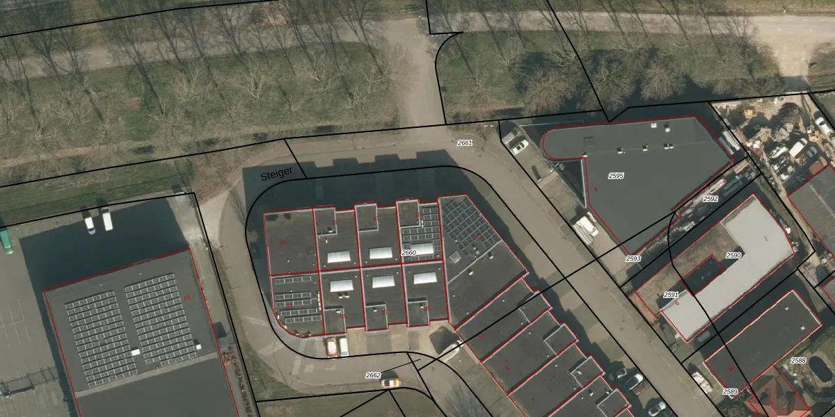 Het perceel waarop Steiger 15 staat heeft een oppervlakte van 2650 m². Dit is een zeer groot perceel. De perceeloppervlakte wordt geregistreerd door het Kadaster. Gedetailleerde informatie over de maten van dit perceel kunt u vinden in het rapport Kadastrale kaart met maatvoering van Steiger 15.