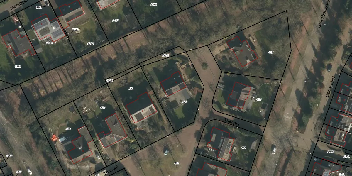 Het perceel waarop Triangel 9 staat heeft een oppervlakte van 967 m². Dit is een groot perceel. De perceeloppervlakte wordt geregistreerd door het Kadaster. Gedetailleerde informatie over de maten van dit perceel kunt u vinden in het rapport Kadastrale kaart met maatvoering van Triangel 9.