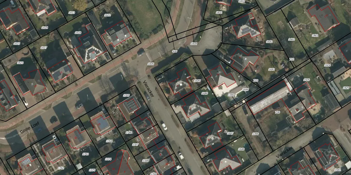Het perceel waarop Vieracker 1 staat heeft een oppervlakte van 447 m². Dit is een groot perceel. De perceeloppervlakte wordt geregistreerd door het Kadaster. Gedetailleerde informatie over de maten van dit perceel kunt u vinden in het rapport Kadastrale kaart met maatvoering van Vieracker 1.