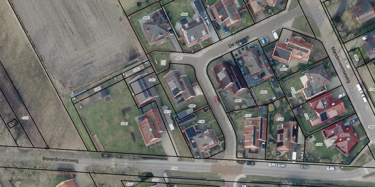 Het perceel waarop De Werent 9 staat heeft een oppervlakte van 494 m². Dit is een groot perceel. De perceeloppervlakte wordt geregistreerd door het Kadaster. Gedetailleerde informatie over de maten van dit perceel kunt u vinden in het rapport Kadastrale kaart met maatvoering van De Werent 9.