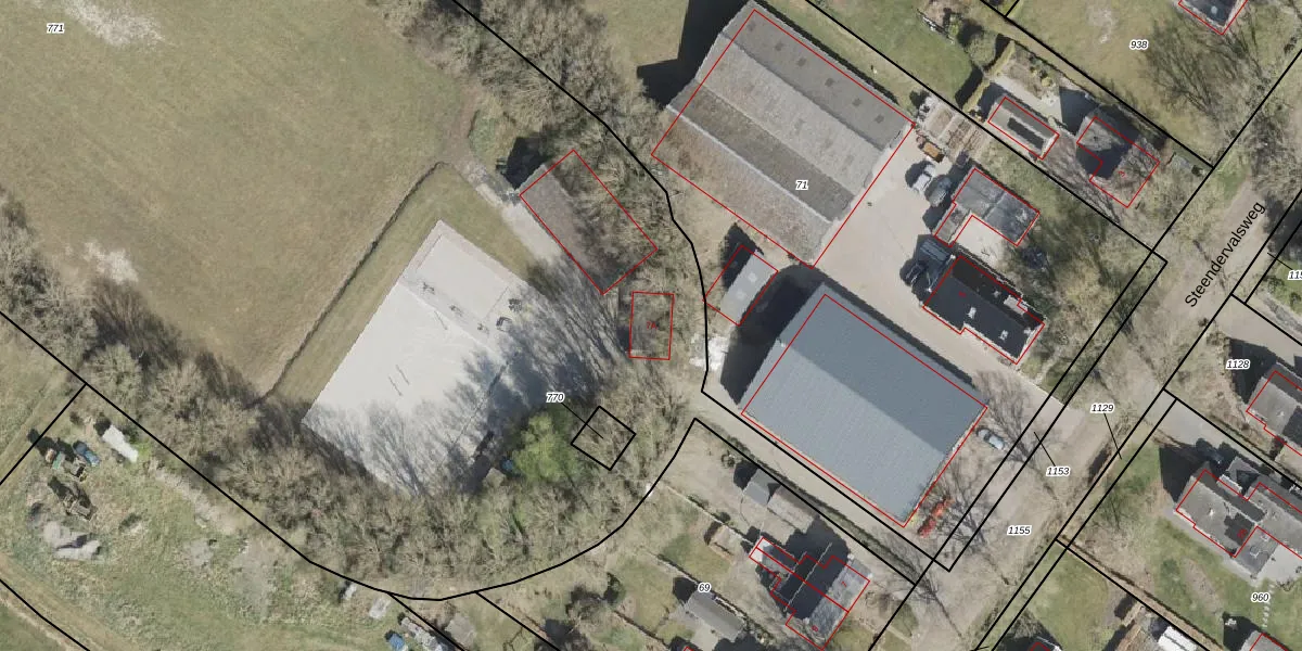 Het perceel waarop Steendervalsweg 7-A staat heeft een oppervlakte van 2,0 ha. Dit is een zeer groot perceel. De perceeloppervlakte wordt geregistreerd door het Kadaster. Gedetailleerde informatie over de maten van dit perceel kunt u vinden in het rapport Kadastrale kaart met maatvoering van Steendervalsweg 7-A.