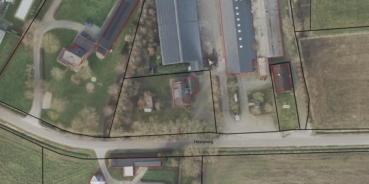 Heesweg 65 is gelegen op kadastraal perceel RTE00F6093. Deze kadastrale aanduiding is uniek en wordt gebruikt door het Kadaster om eigendomsrechten en andere zakelijke rechten vast te leggen. Het perceel maakt onderdeel uit van de kadastrale gemeente Raalte.