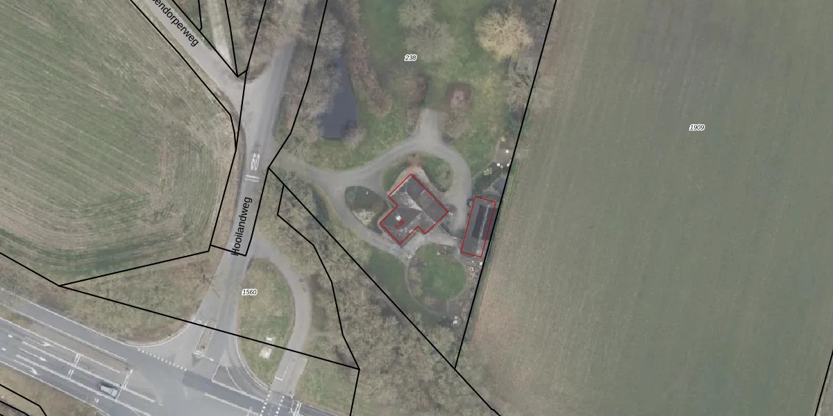 Het perceel waarop Hooilandweg 2-b staat heeft een oppervlakte van 5910 m². Dit is een zeer groot perceel. De perceeloppervlakte wordt geregistreerd door het Kadaster. Gedetailleerde informatie over de maten van dit perceel kunt u vinden in het rapport Kadastrale kaart met maatvoering van Hooilandweg 2-b.