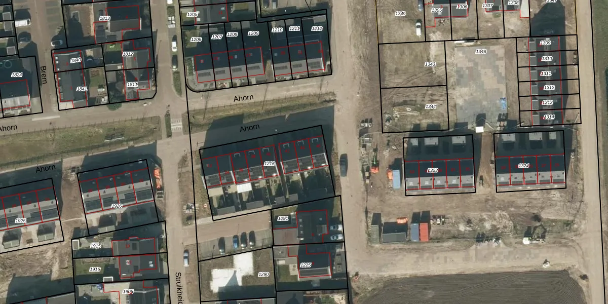Het perceel waarop Ahorn 44 staat heeft een oppervlakte van 977 m². Dit is een groot perceel. De perceeloppervlakte wordt geregistreerd door het Kadaster. Gedetailleerde informatie over de maten van dit perceel kunt u vinden in het rapport Kadastrale kaart met maatvoering van Ahorn 44.