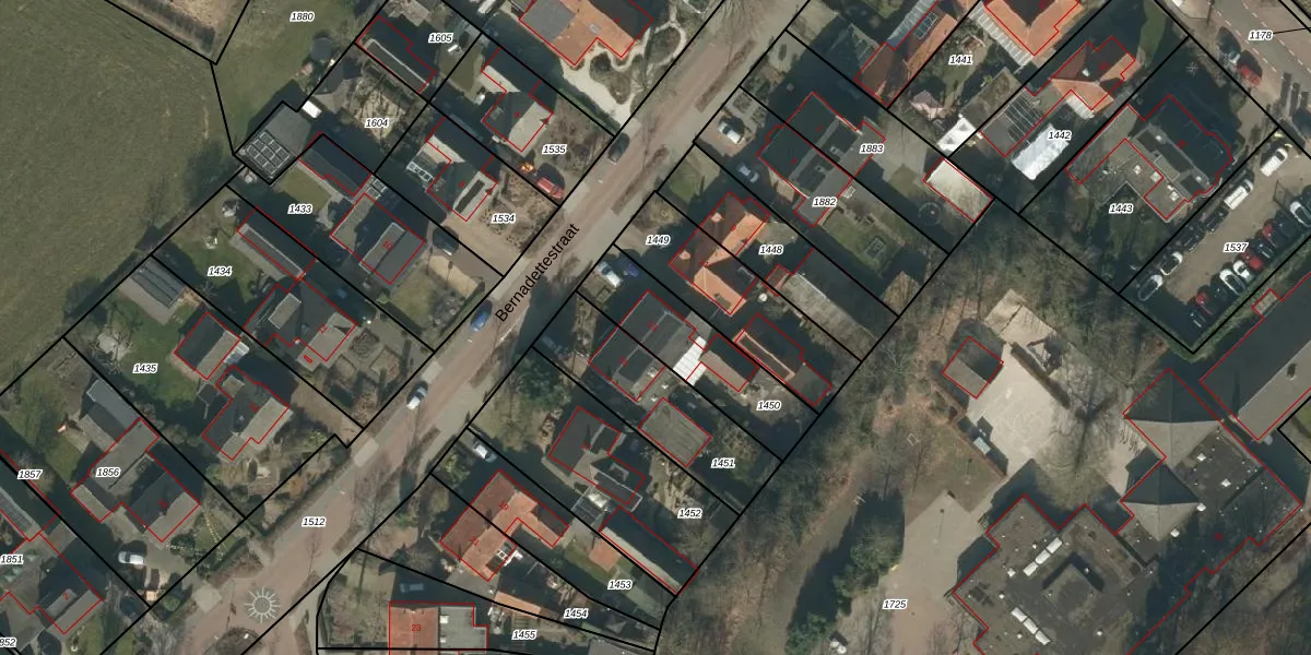 Bernadettestraat 13 is gelegen op kadastraal perceel LHT00C1450. Deze kadastrale aanduiding is uniek en wordt gebruikt door het Kadaster om eigendomsrechten en andere zakelijke rechten vast te leggen. Het perceel maakt onderdeel uit van de kadastrale gemeente Lieshout.