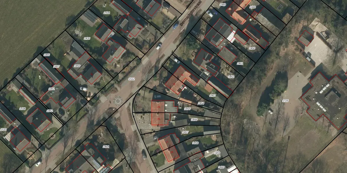 Bernadettestraat 21 is gelegen op kadastraal perceel LHT00C1454. Deze kadastrale aanduiding is uniek en wordt gebruikt door het Kadaster om eigendomsrechten en andere zakelijke rechten vast te leggen. Het perceel maakt onderdeel uit van de kadastrale gemeente Lieshout.