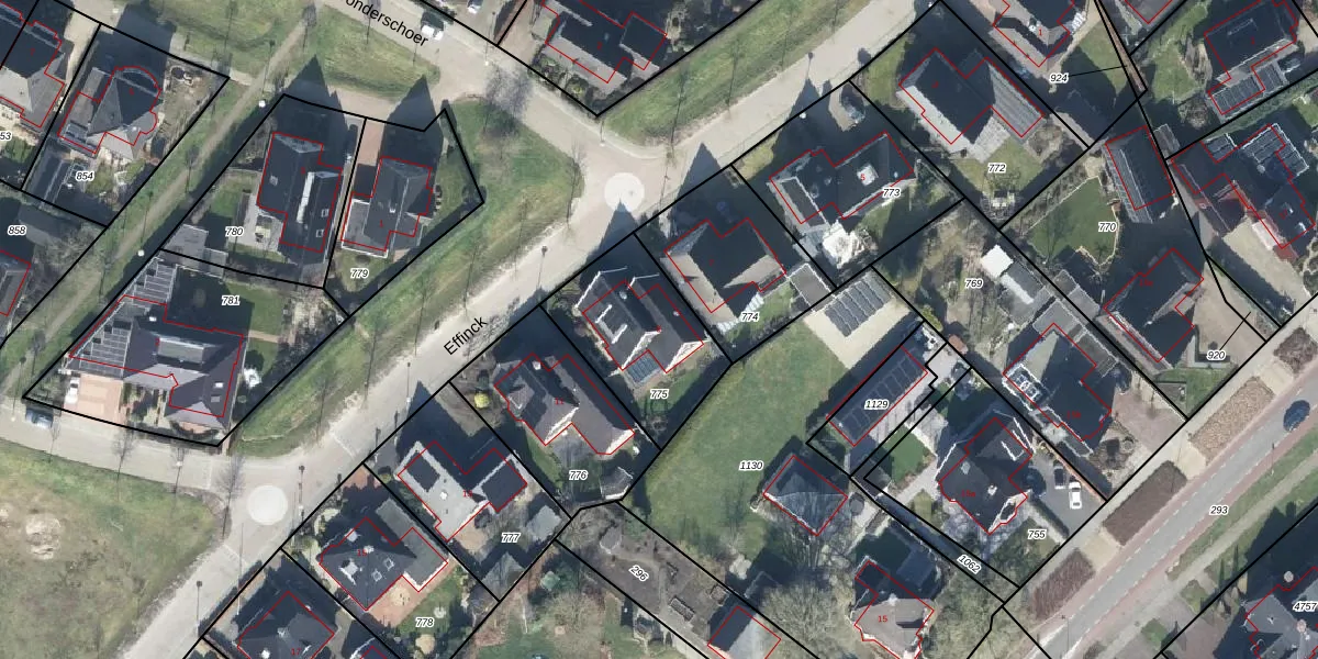 Het perceel waarop Effinck 9 staat heeft een oppervlakte van 465 m². Dit is een groot perceel. De perceeloppervlakte wordt geregistreerd door het Kadaster. Gedetailleerde informatie over de maten van dit perceel kunt u vinden in het rapport Kadastrale kaart met maatvoering van Effinck 9.