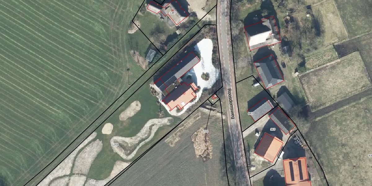 Het perceel waarop Roosdomsweg 32 staat heeft een oppervlakte van 3654 m². Dit is een zeer groot perceel. De perceeloppervlakte wordt geregistreerd door het Kadaster. Gedetailleerde informatie over de maten van dit perceel kunt u vinden in het rapport Kadastrale kaart met maatvoering van Roosdomsweg 32.