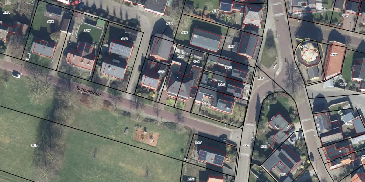 Het perceel waarop Schoolstraat 19 staat heeft een oppervlakte van 319 m². Dit is een groot perceel. De perceeloppervlakte wordt geregistreerd door het Kadaster. Gedetailleerde informatie over de maten van dit perceel kunt u vinden in het rapport Kadastrale kaart met maatvoering van Schoolstraat 19.
