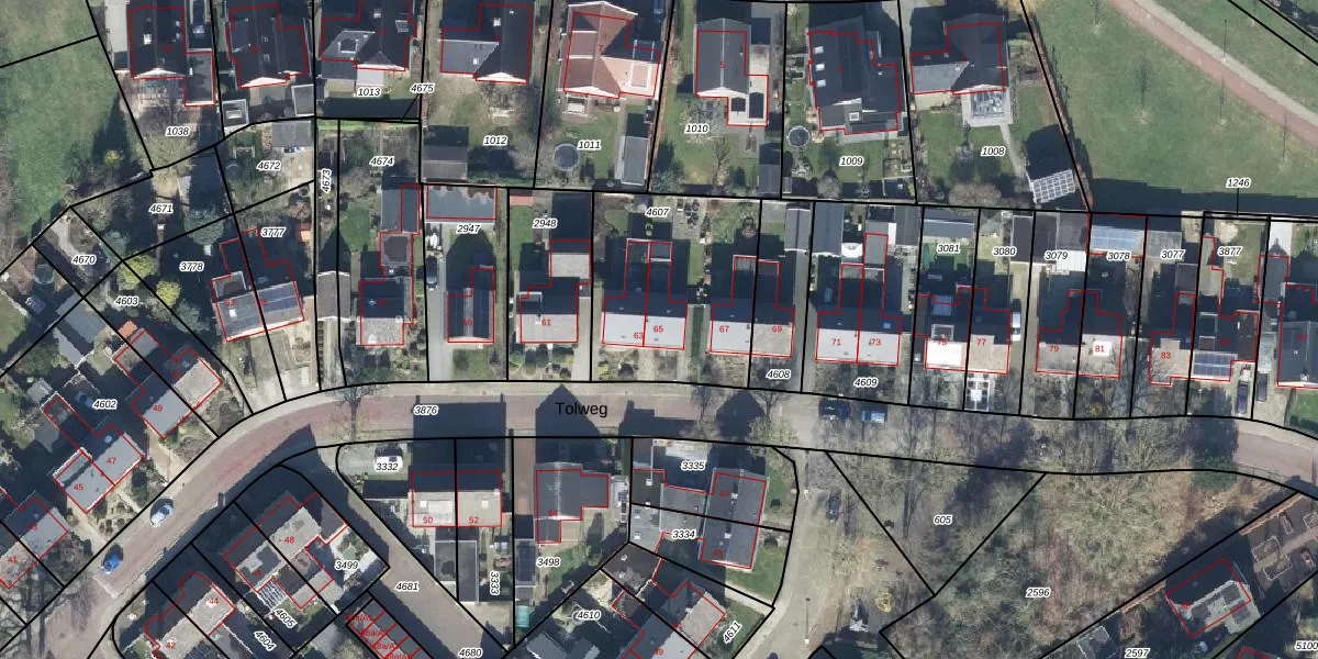 Het perceel waarop Tolweg 65 staat heeft een oppervlakte van 704 m². Dit is een groot perceel. De perceeloppervlakte wordt geregistreerd door het Kadaster. Gedetailleerde informatie over de maten van dit perceel kunt u vinden in het rapport Kadastrale kaart met maatvoering van Tolweg 65.