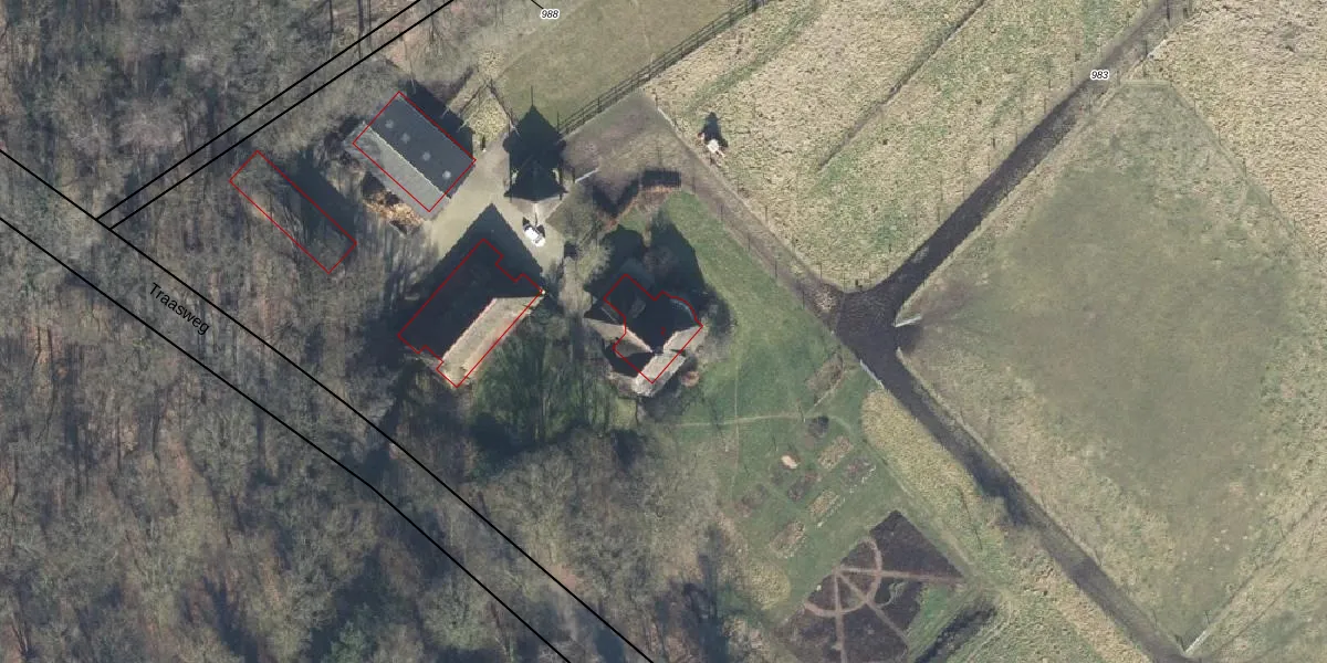 Het perceel waarop Traasweg 2 staat heeft een oppervlakte van 5,6 ha. Dit is een zeer groot perceel. De perceeloppervlakte wordt geregistreerd door het Kadaster. Gedetailleerde informatie over de maten van dit perceel kunt u vinden in het rapport Kadastrale kaart met maatvoering van Traasweg 2.