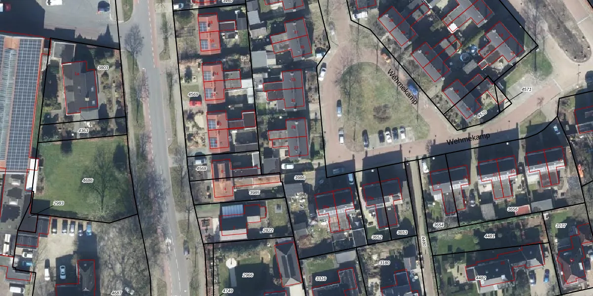 Het perceel waarop Wehmekamp 27 staat heeft een oppervlakte van 2628 m². Dit is een zeer groot perceel. De perceeloppervlakte wordt geregistreerd door het Kadaster. Gedetailleerde informatie over de maten van dit perceel kunt u vinden in het rapport Kadastrale kaart met maatvoering van Wehmekamp 27.