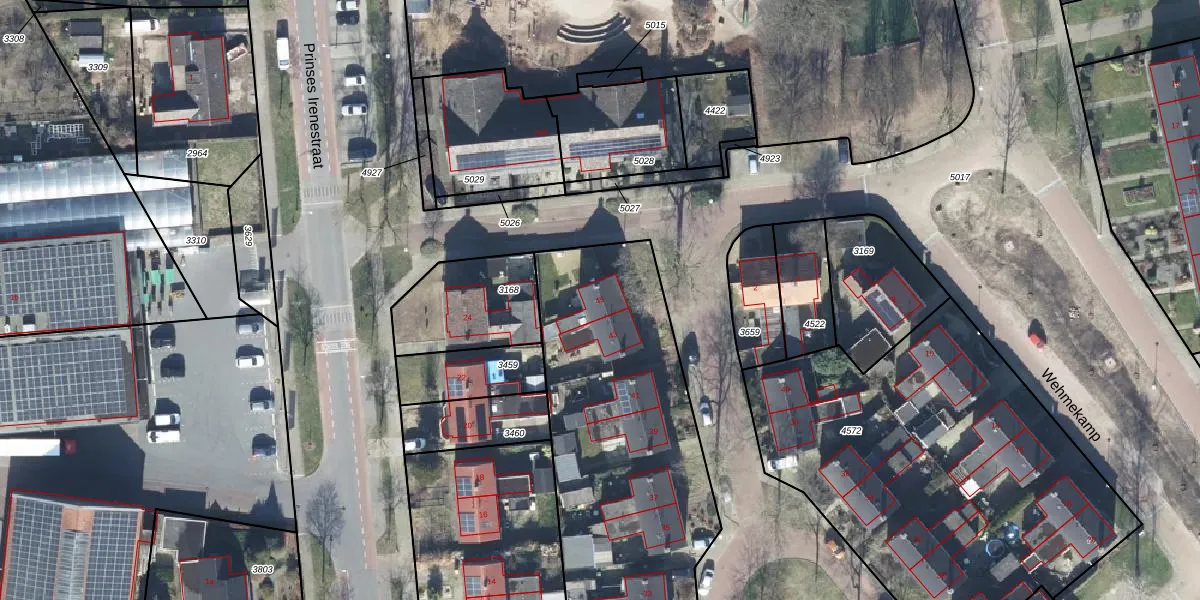 Het perceel waarop Wehmekamp 45 staat heeft een oppervlakte van 2628 m². Dit is een zeer groot perceel. De perceeloppervlakte wordt geregistreerd door het Kadaster. Gedetailleerde informatie over de maten van dit perceel kunt u vinden in het rapport Kadastrale kaart met maatvoering van Wehmekamp 45.
