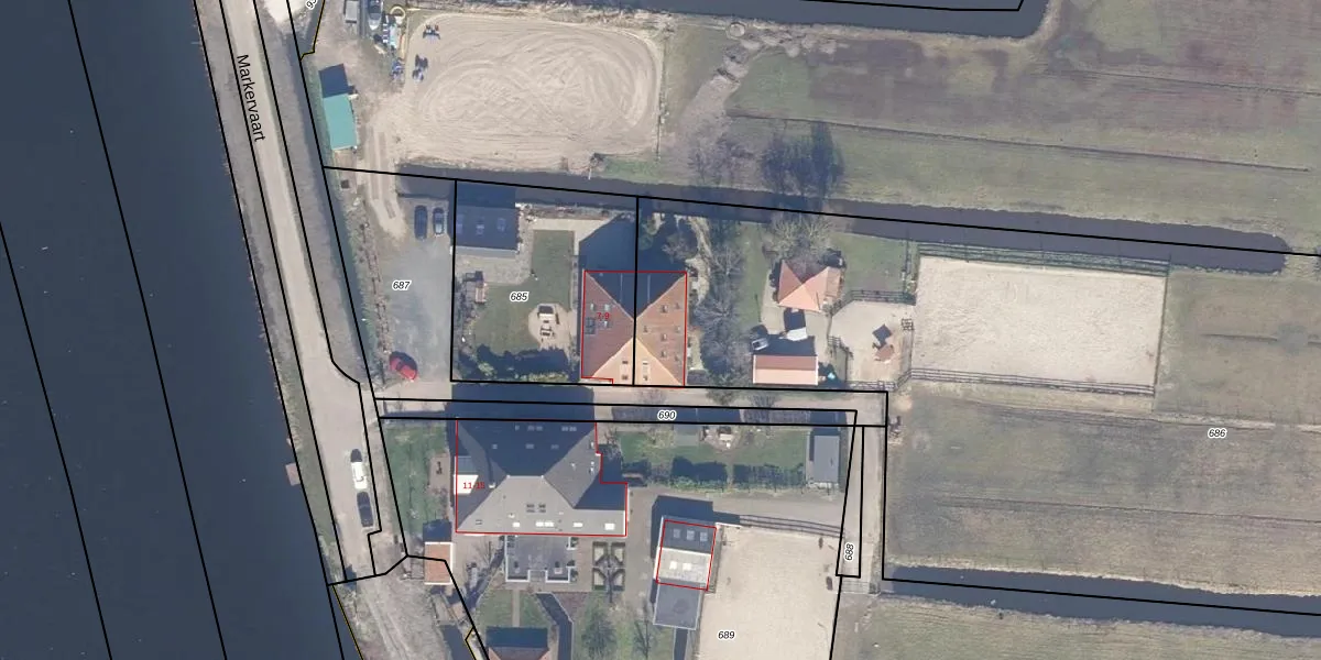 Het perceel waarop Markervaart 9 staat heeft een oppervlakte van 6910 m². Dit is een zeer groot perceel. De perceeloppervlakte wordt geregistreerd door het Kadaster. Gedetailleerde informatie over de maten van dit perceel kunt u vinden in het rapport Kadastrale kaart met maatvoering van Markervaart 9.