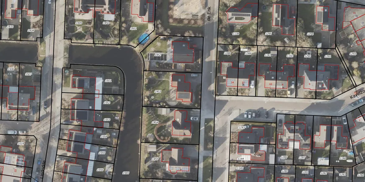 Het perceel waarop de Enk 4 staat heeft een oppervlakte van 630 m². Dit is een groot perceel. De perceeloppervlakte wordt geregistreerd door het Kadaster. Gedetailleerde informatie over de maten van dit perceel kunt u vinden in het rapport Kadastrale kaart met maatvoering van de Enk 4.