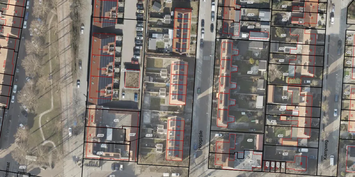 Het perceel waarop Hoogzijde 55 staat heeft een oppervlakte van 3735 m². Dit is een zeer groot perceel. De perceeloppervlakte wordt geregistreerd door het Kadaster. Gedetailleerde informatie over de maten van dit perceel kunt u vinden in het rapport Kadastrale kaart met maatvoering van Hoogzijde 55.